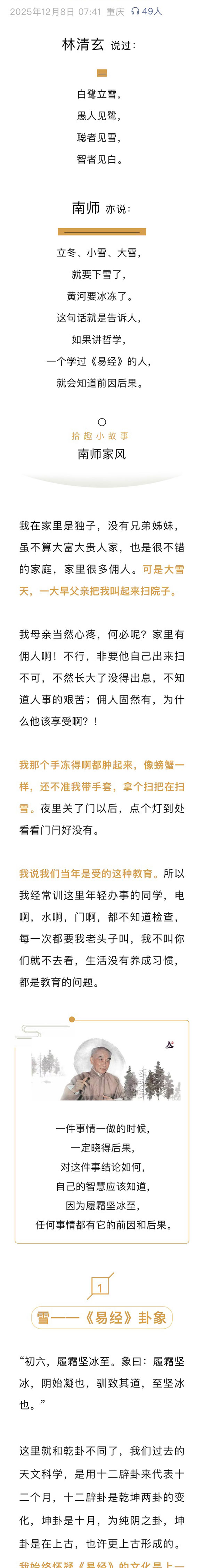 南怀瑾先生:履霜坚冰至,任何事情都有它的前因和后果(大雪)